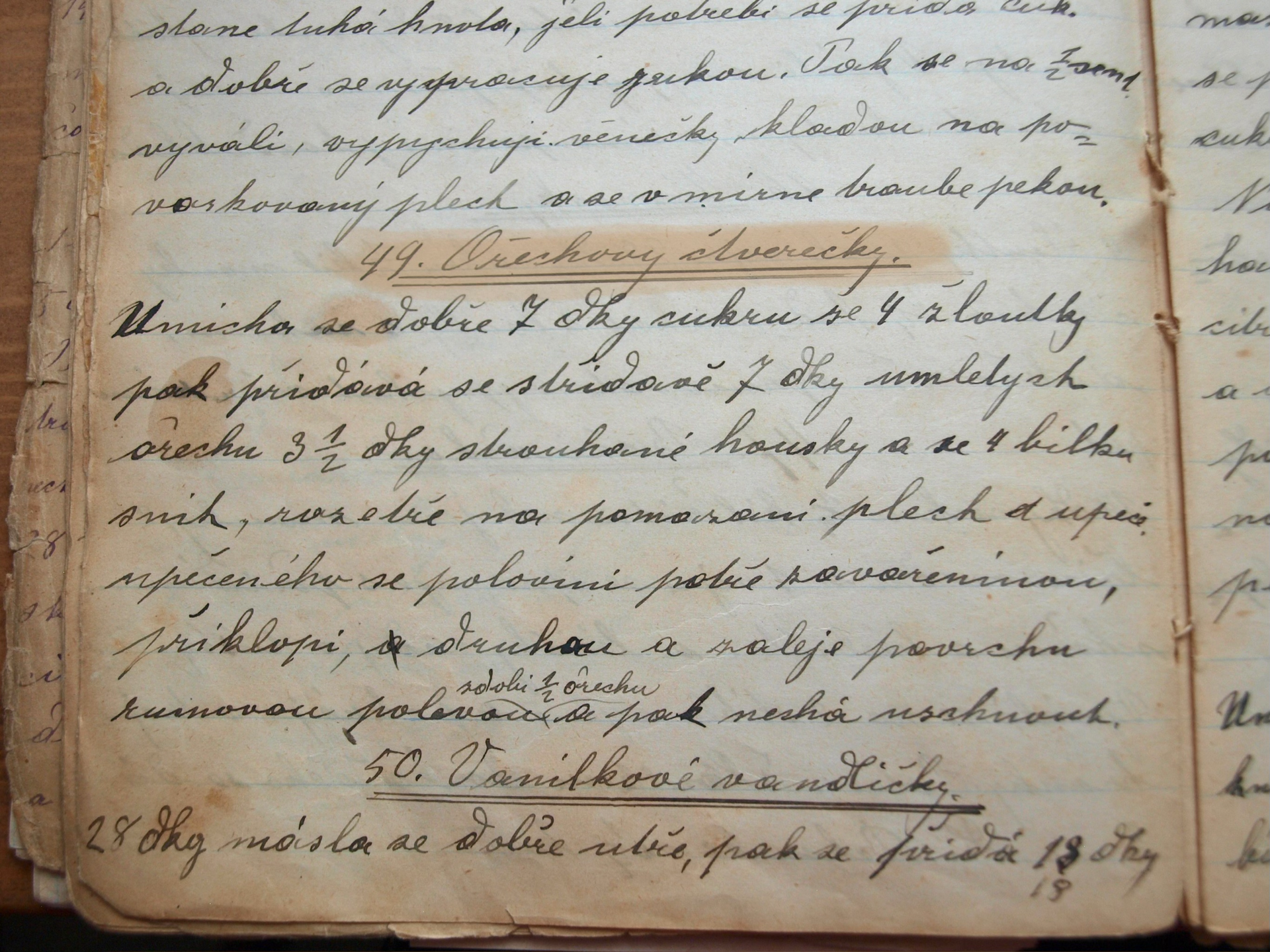 Doslovný přepis receptu: OŘECHOVY ČTVEREČKY. Umíchá se dobře 7 dkg cukru ze 4 žloutky pak přidává se střídavě 7 dkg umletych ořechu 3 1⁄2 dkg strouhané housky a ze 4 bílku sníh, rozetře na pomazaní plech a upeče. upečeného se polovina potře zavařeninou, přiklopí, druhou a zaleje povrchu rumovou polevou (zdobí 1⁄2 ořechu) a pak nechá uschnout.
