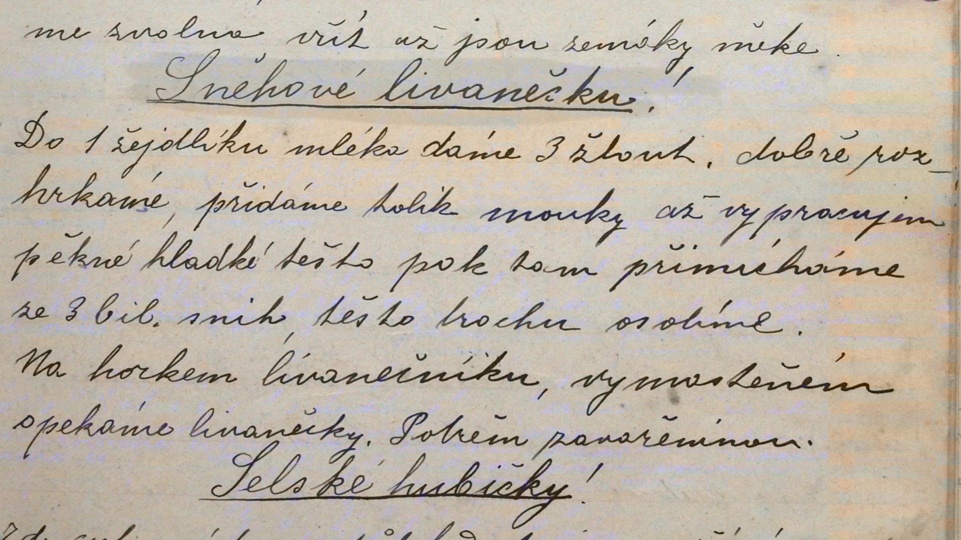 Doslovný přepis receptu: SNĚHOVÉ LÍVANEČKU! Do 1 žejdlíku mléka dáme 3 žlout.dobře rozhrkáme, přidáme tolik mouky až vypracujeme pěkné hladké těsto pak tam přimícháme ze 3 bílků sníh, těsto trochu osolíme. Na horkém lívanečníku, vymastěném spékáme livanečky. Potřeme zavařeninou.